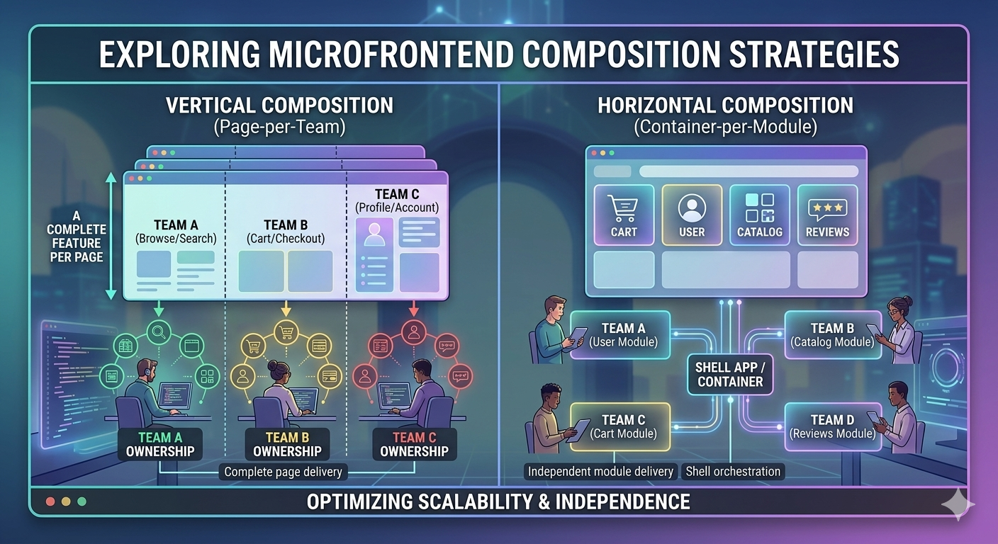 Absolutely. Many real-world architectures use a vertical split at the route level with horizontal composition within certain pages. For instance, /checkout might be its own vertical MF, but the product listing page might horizontally compose a catalog MF, a search MF, and a recommendations MF.