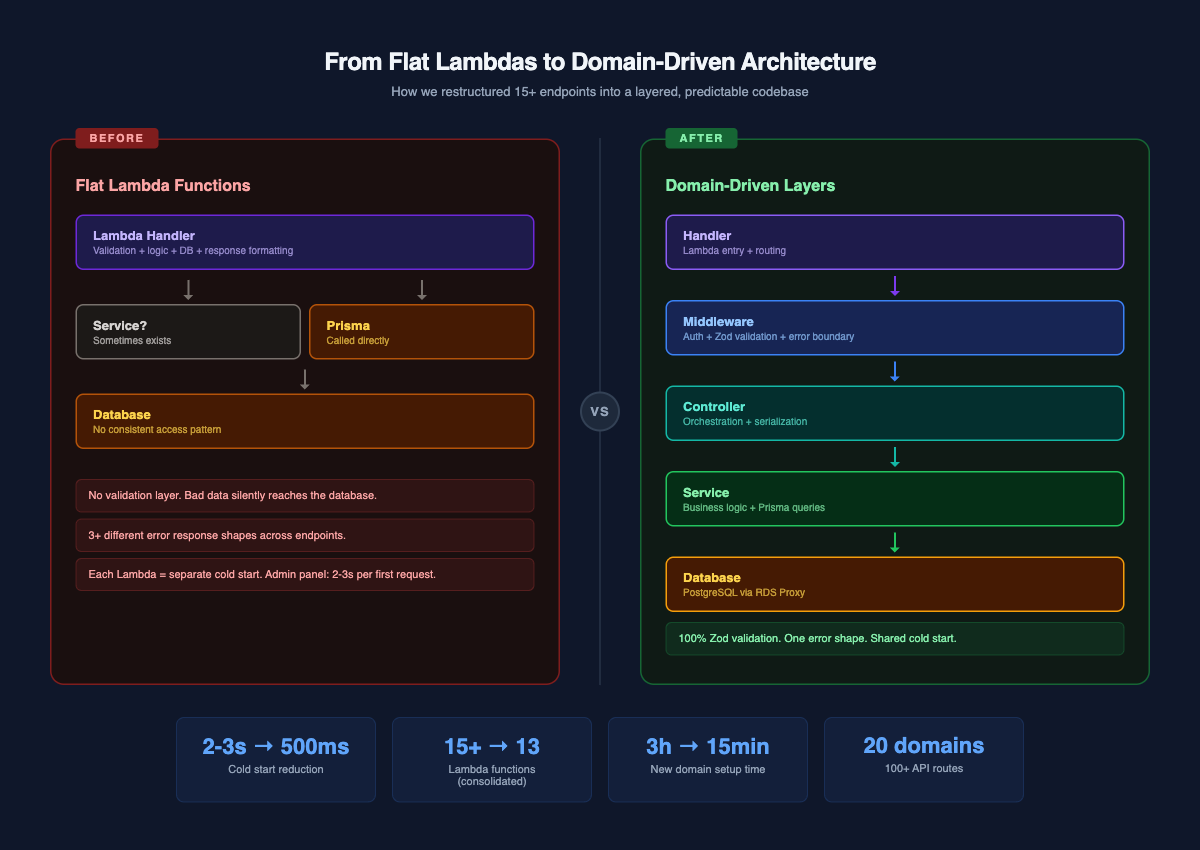 - We started with flat Lambda functions that directly called Prisma, had no validation layer, and inconsistent error handling across 15+ endpoints